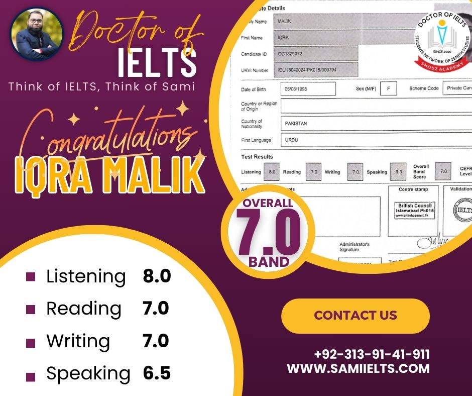 Congratulations to Iqra Malik for achieving an excellent 7.0 Band in the IELTS exam!