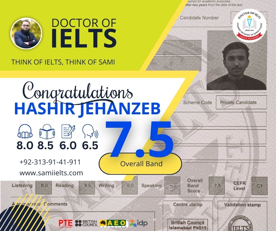 Congratulations to Hashir Jehanzeb for achieving an outstanding 7.5 Band in the IELTS exam!