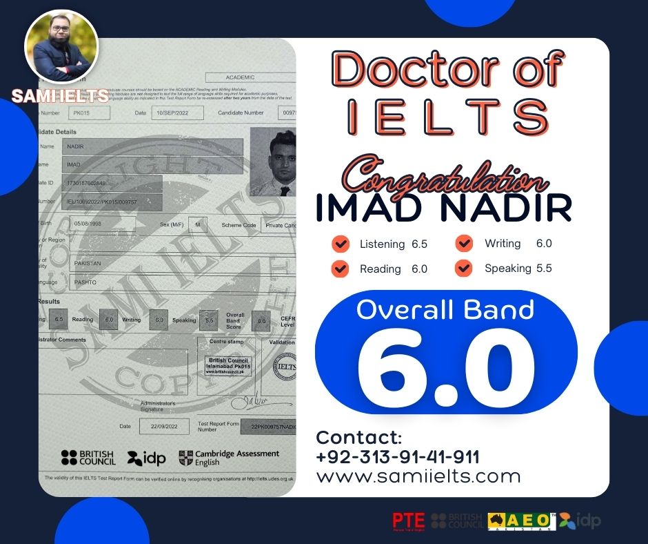 Congratulations to Imad Nadir for achieving an impressive 6.0 Band in the IELTS exam!