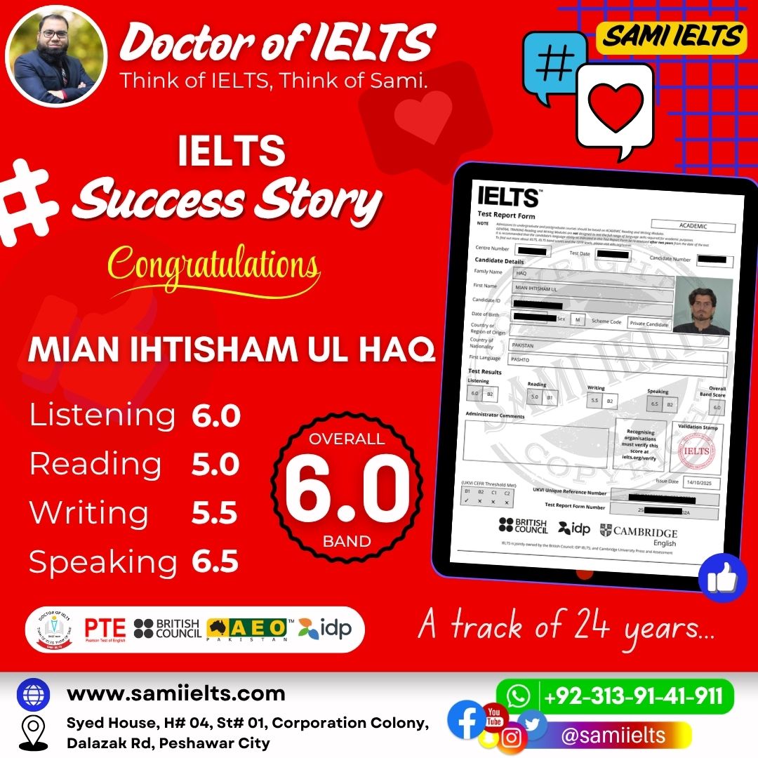 Congratulations to Mian Muhammad Waqas for achieving an excellent 6.0 Band in the IELTS exam!