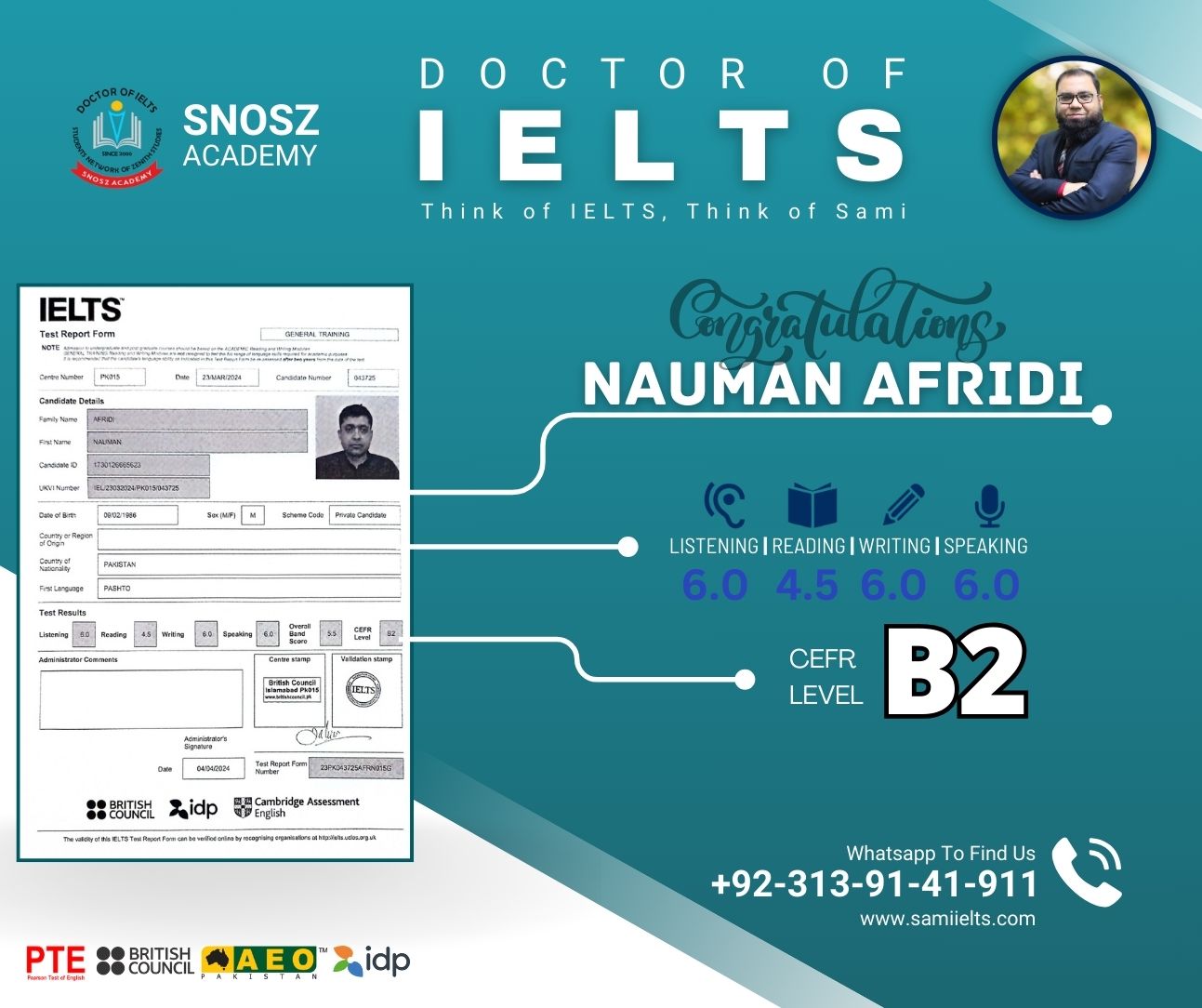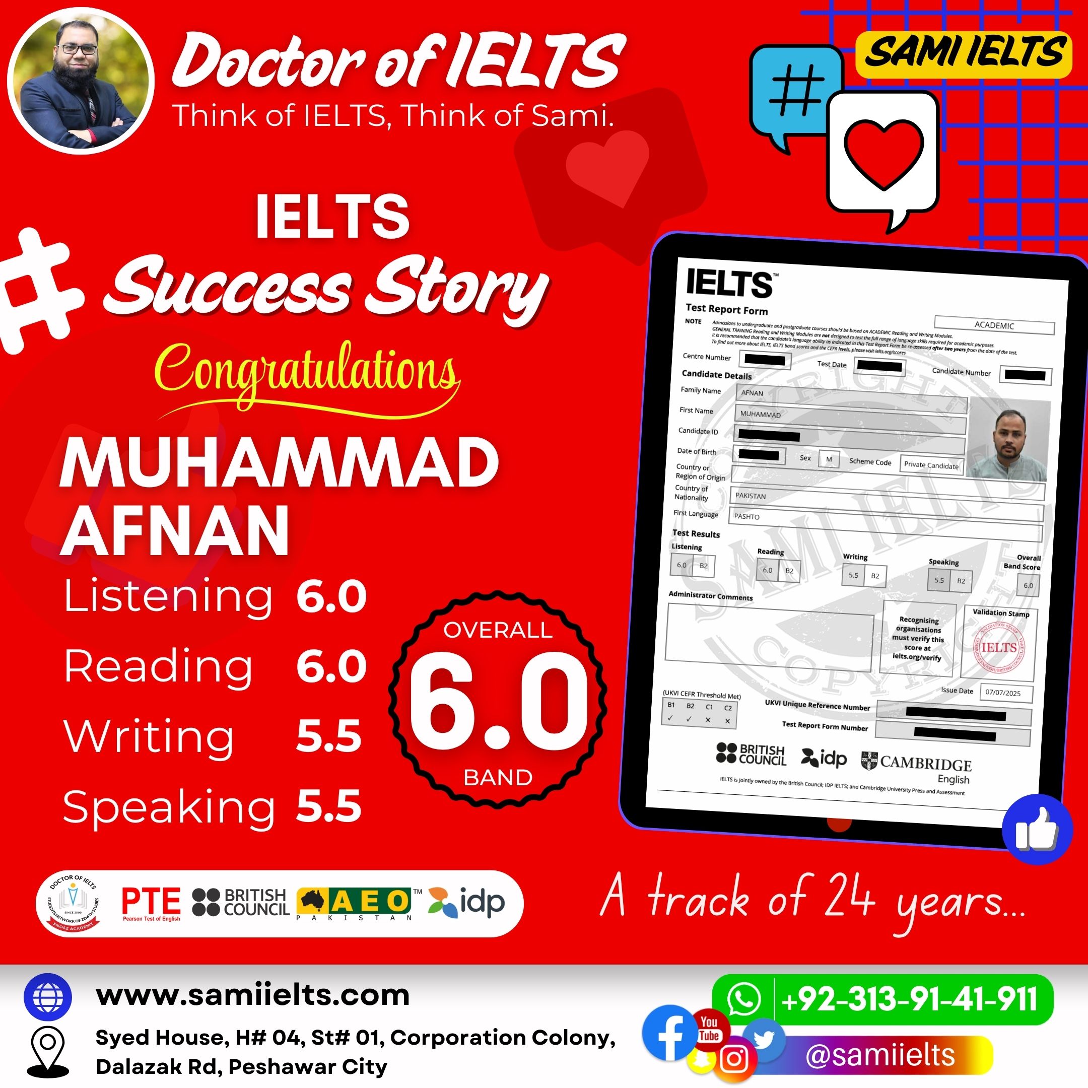 Congratulations to Muhammad Afnan for achieving a 6.0 Overall Band Score in the IELTS exam!