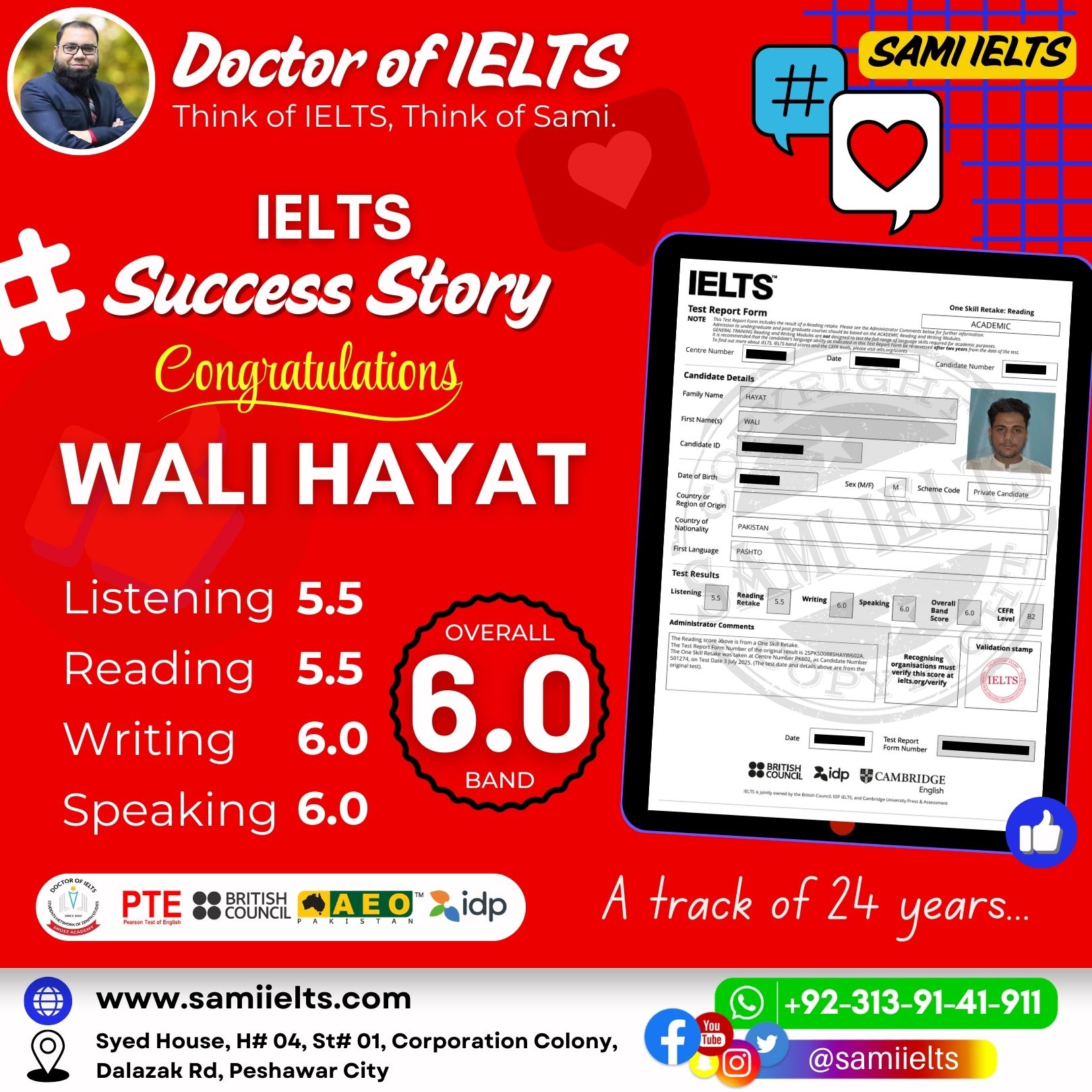 Congratulations to Wali Hayat for achieving a 6.0 Overall Band Score in the IELTS exam!