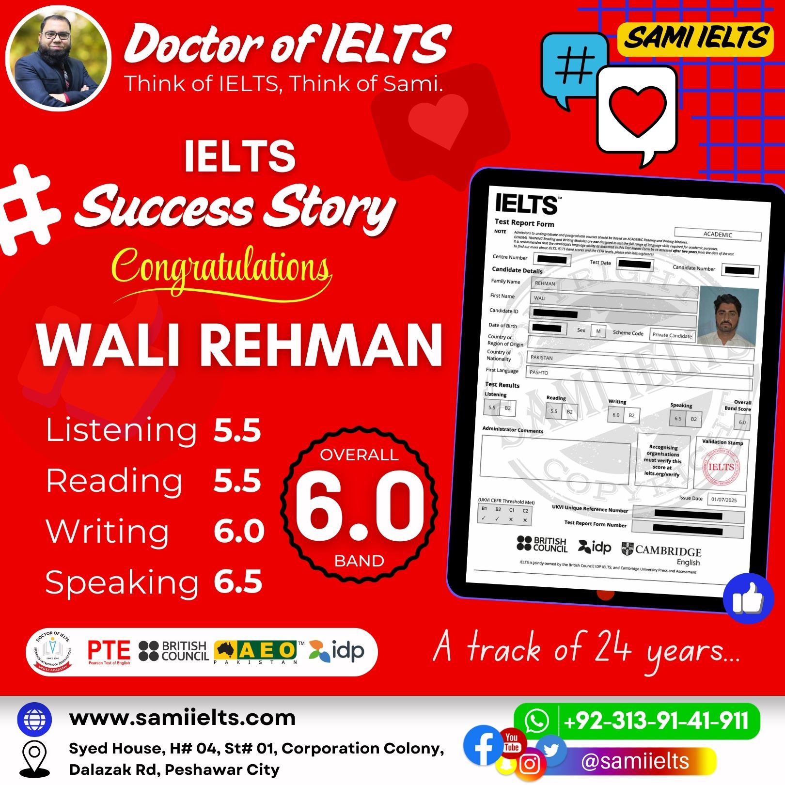 Congratulations to Wali Rehman for securing a 6.0 Overall Band Score in the IELTS exam!