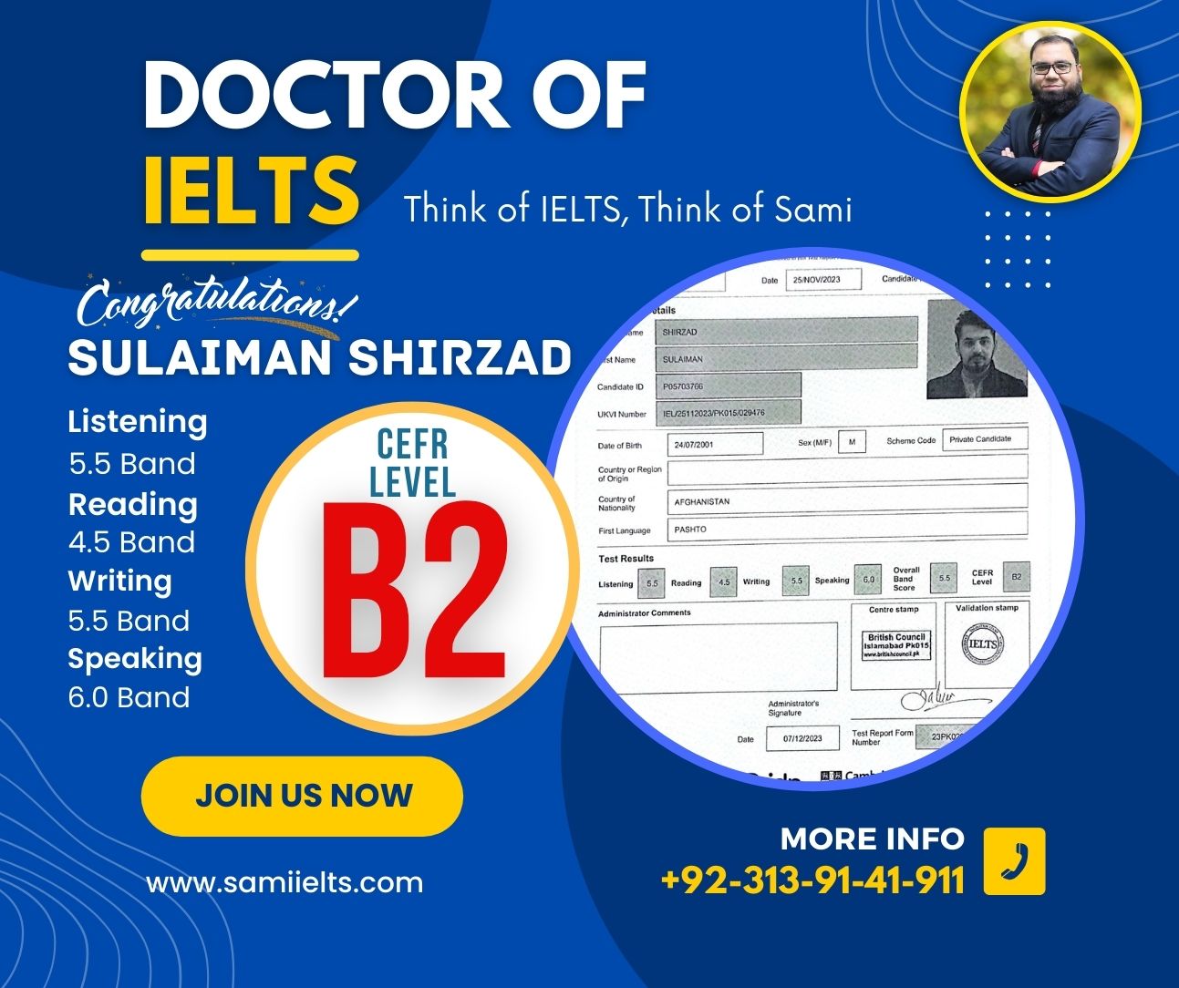 Congratulations to Sulaiman Shirzad on successfully achieving CEFR Level B2 in English proficiency!