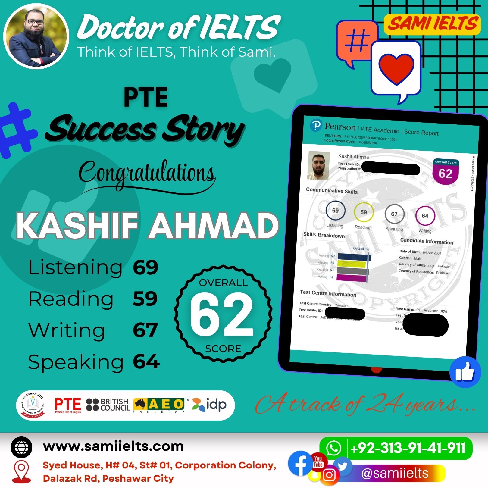 Congratulations to Kashif Ahmad for achieving an excellent 62 Overall Score in the PTE exam!