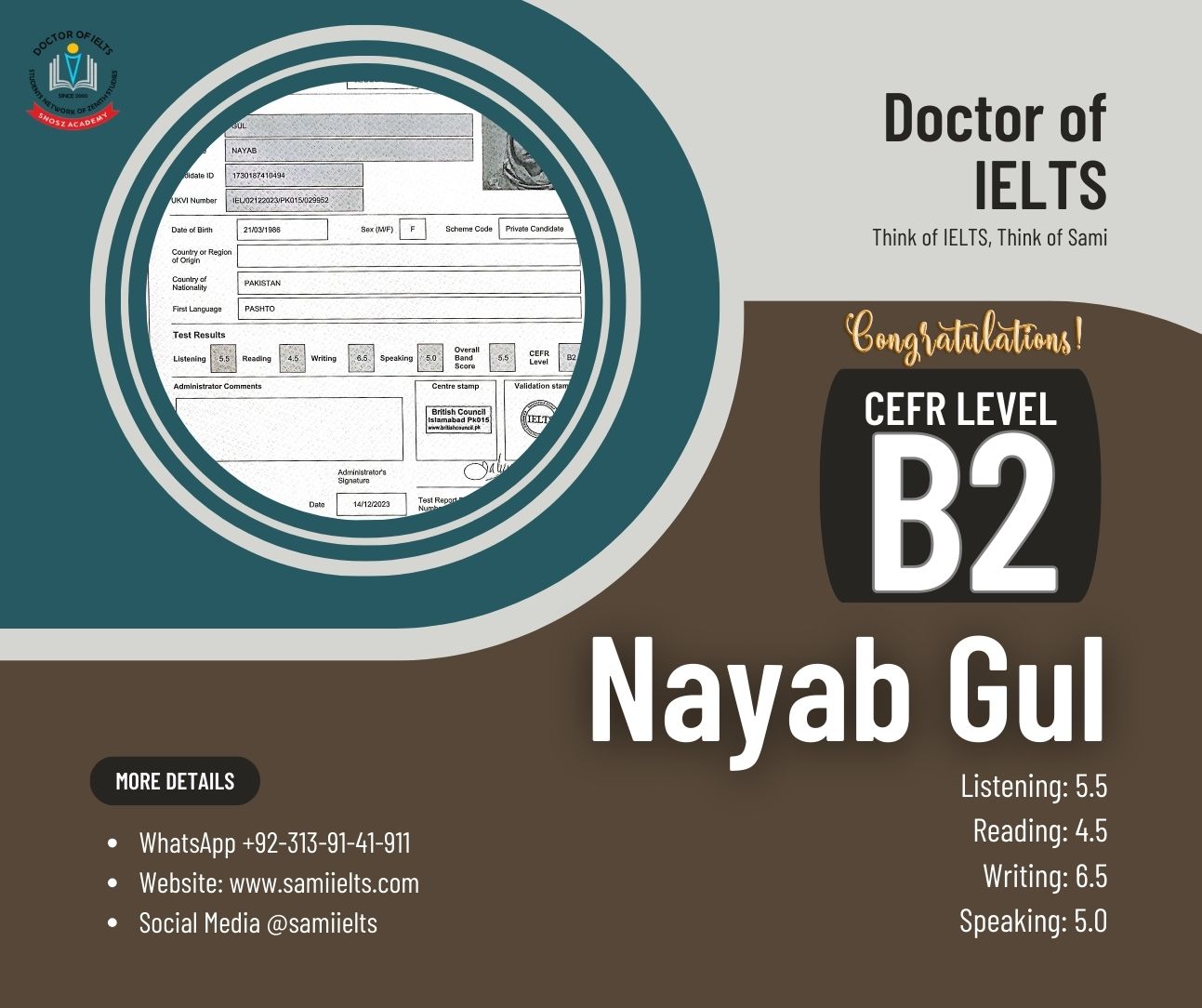 Congratulations to Nayab Gul for successfully achieving CEFR Level B2 in her English language assessment!