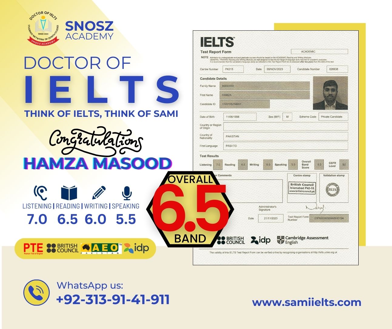 Congratulations to Hamza Masood for achieving an impressive 6.5 Band in the IELTS exam!