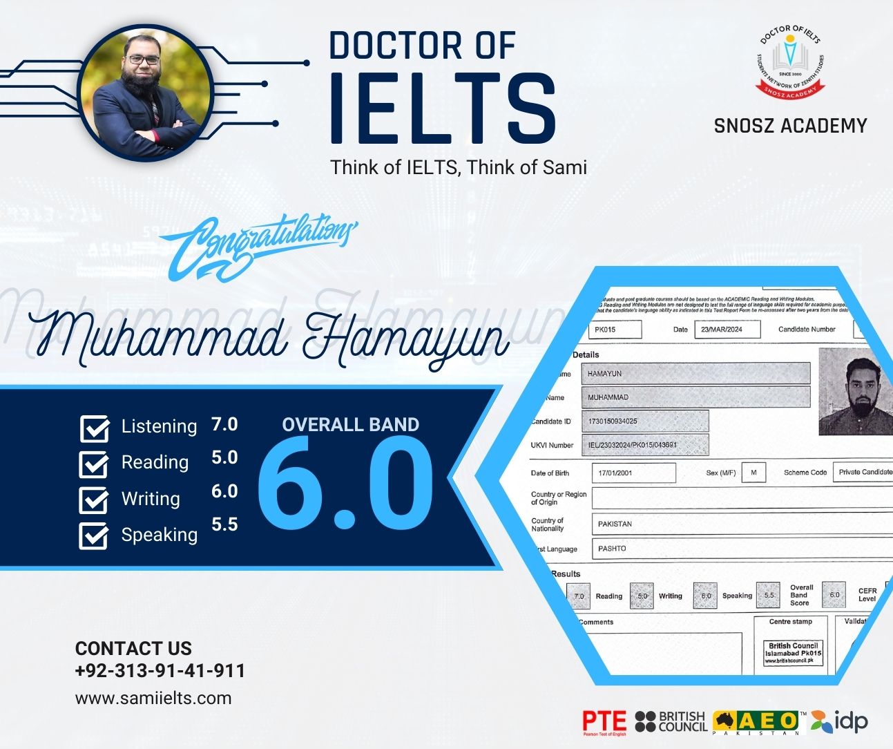 Congratulations to Muhammad Hamayun for securing a 6.0 Band in the IELTS exam!