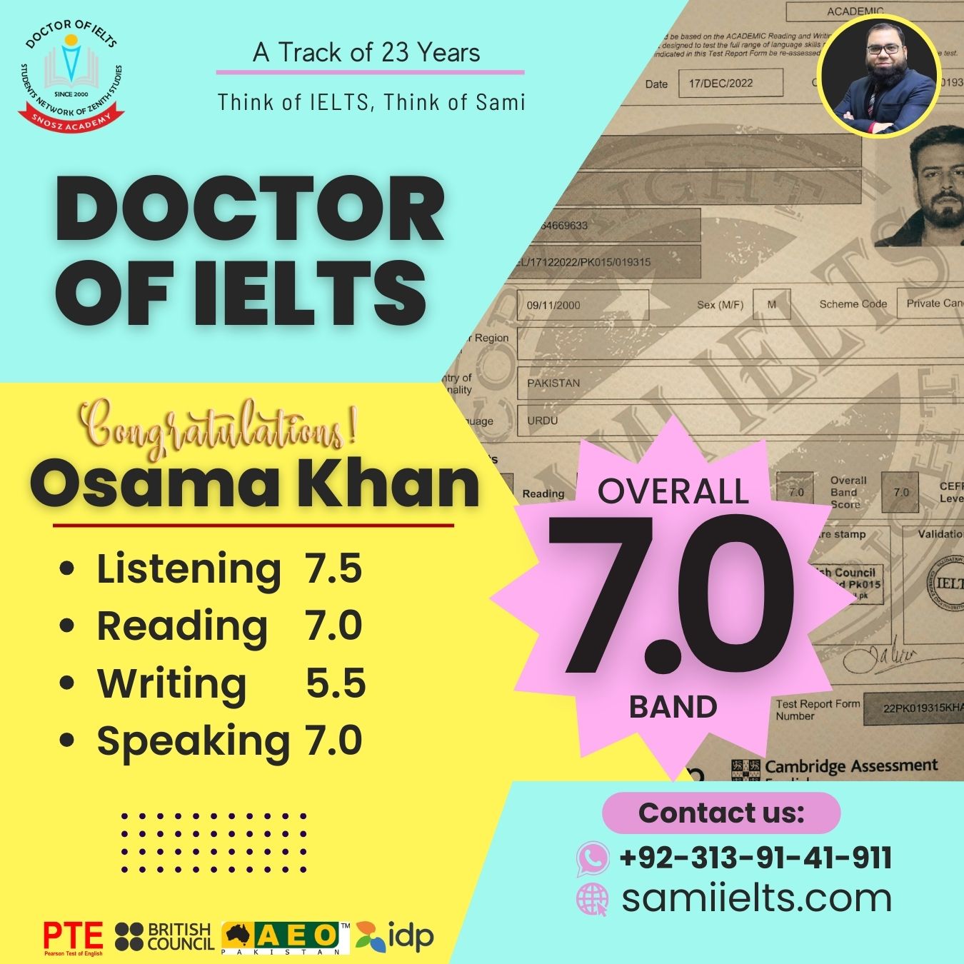 Massive Congratulations to OSAMA KHAN on securing an impressive 7.0 Band in the IELTS exam!