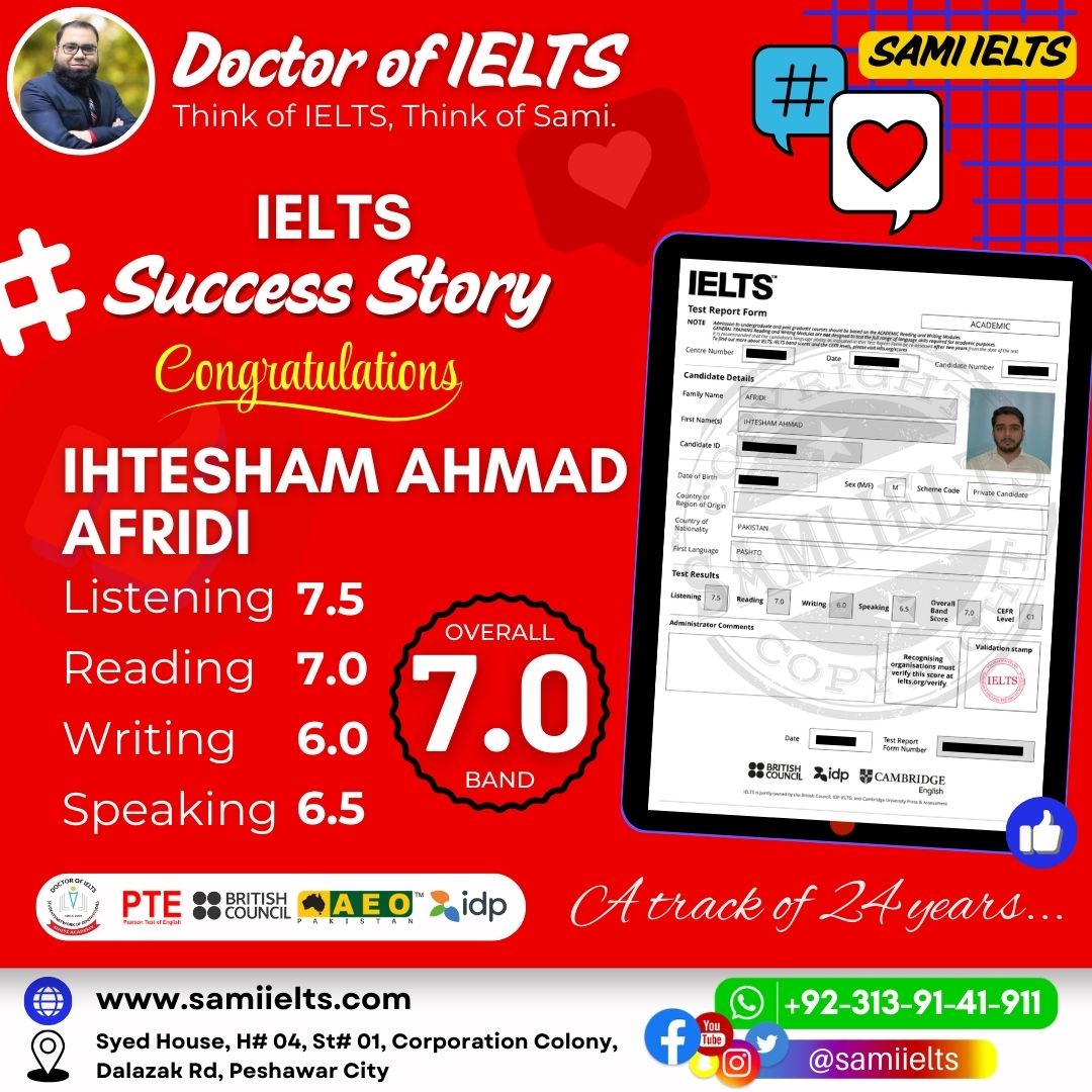 A Big Congratulations to IHTESHAM AHMAD AFRIDI for achieving a remarkable 7.0 Band in the IELTS exam!