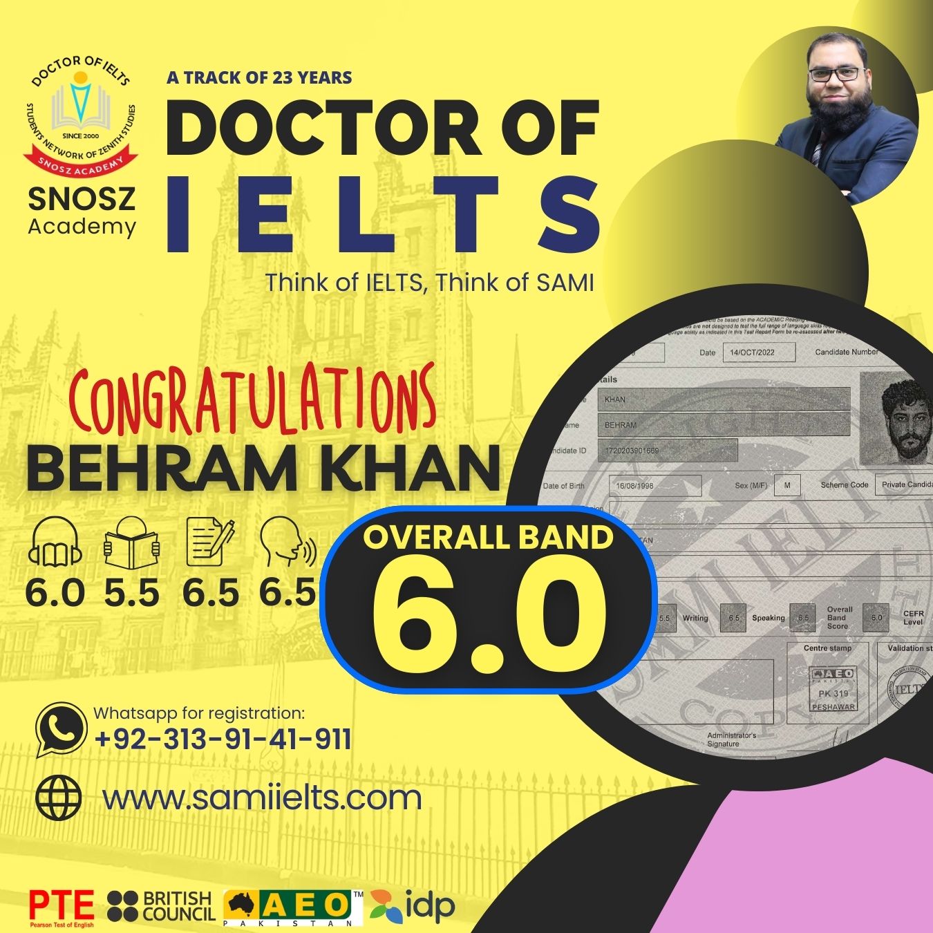 Congratulations to BEHRAM KHAN on achieving a 6.0 Band Score in the IELTS exam!